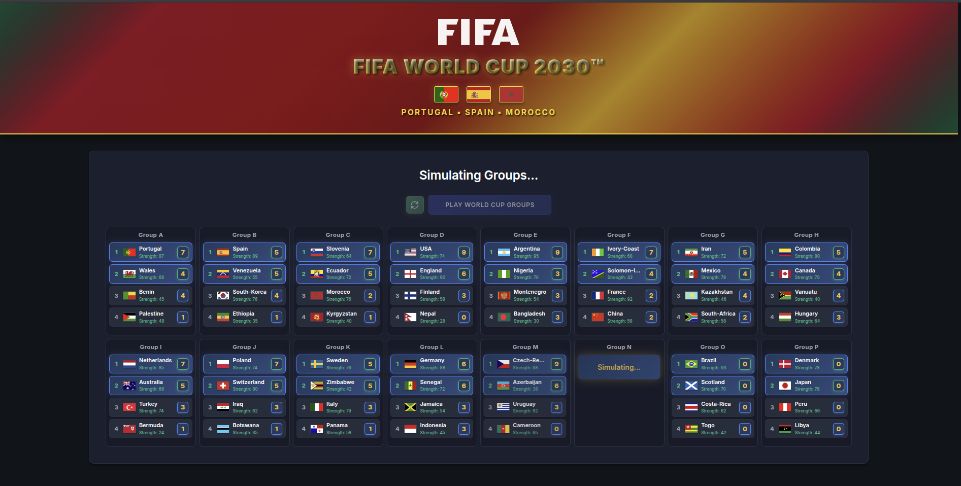 A lightweight, zero-dependency World Cup simulator that runs entirely in the browser — smooth animations, realistic match logic and a clean visual experience built from scratch with vanilla JS.